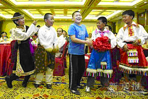 ? ? ? ??昨晚,在天壇飯店舉行的歡迎會上,16名西藏少年同16名北京少年正式結(jié)對并進行歌舞聯(lián)歡。自10月1日起,西藏少年將入住與其結(jié)對的北京少年家里,共度5天假期。